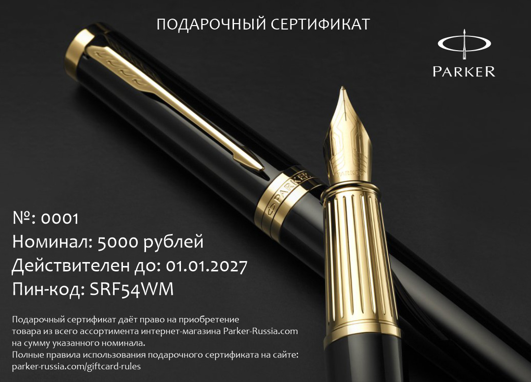Подарочный сертификат Parker 5000 от официального дилера Parker в Назране. Вы можете дополнительно заказать гравировку, которая подчеркнет Вашу оригинальность и придаст памятность статусному подарку. Все ручки Паркер поставляются в фирменном футляре.